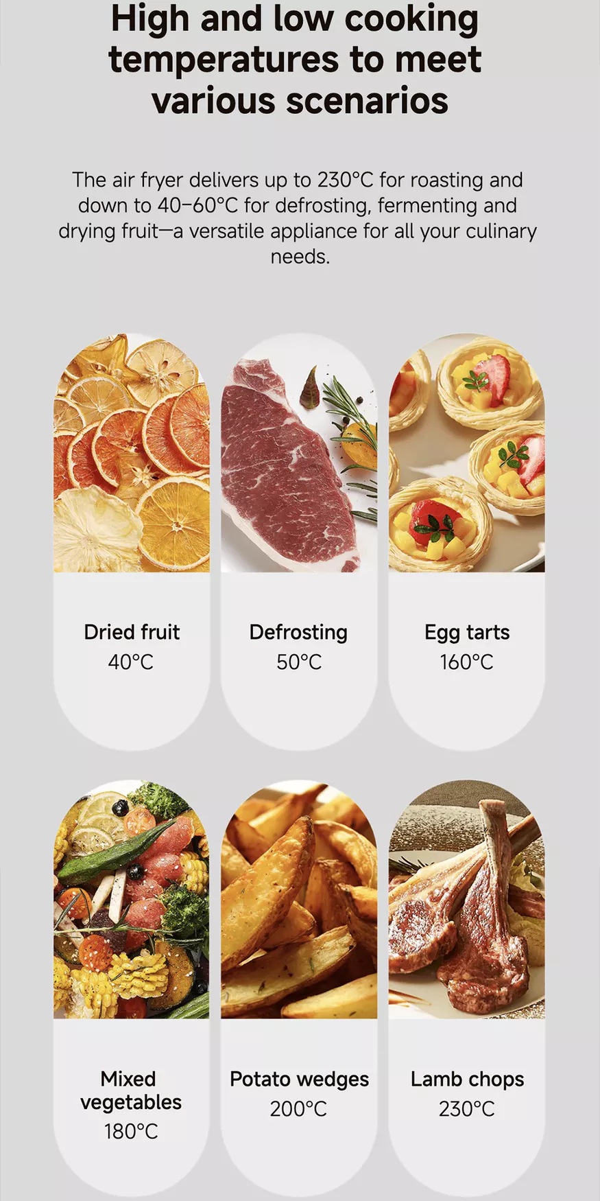 Supports frying, roasting, baking, grilling, reheating, and more for versatile, hassle-free cooking.
