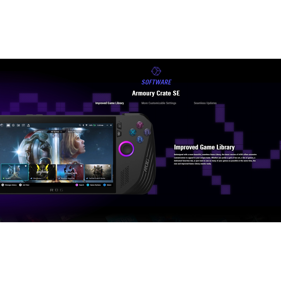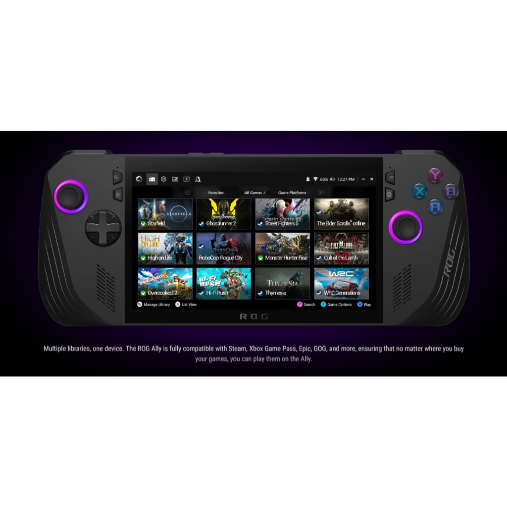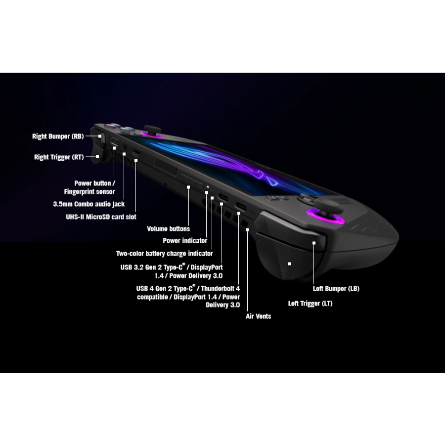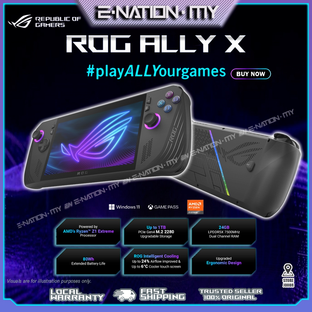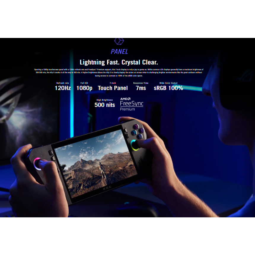 ASUS ROG Ally X (2024) RC72LA | 120Hz FHD 1080p | AMD Ryzen Z1 Extreme Processor | 1TB M.2 NVMe™ PCIe® 4.0 SSD [WARRANTY: 2 Years Asus Global Warranty] Operating System: Windows 11 Home Processor: - CPU: AMD Ryzen™ Z1 Extreme Processor ("Zen4" architecture with 4nm process, 8-core /16-threads, 24MB total cache, up to 5.10 Ghz boost) - GPU: AMD Radeon™ Graphics (AMD RDNA™ 3, 12 CUs, up to 2.7 GHz, up to 8.6 Teraflops) TDP: 9-30W Display: 7-inch FHD (1920 x 1080) 16:9 IPS-level: glossy display sRGB: 100% Adobe: 75.35% Gorilla® Glass Victus™ Touch Screen (10-point multi-touch) Refresh Rate: 120Hz Response Time: 7ms Brightness: 500nits FreeSync Premium Memory: 12GB*2 LPDDR5 on board | Support dual channel memory Storage: 1TB PCIe® 4.0 NVMe™ M.2 SSD (2280) Battery: 80WHrs, 4S1P, 4-cell Li-ion AURA SYNC: Yes Weight: 678 g Dimensions (W x D x H): 28.0 x 11.1 x 2.47 ~ 3.69 cm (11.02" x 4.37" x 0.97" ~ 1.45") What's in the Box: ASUS ROG Ally X 7" 120Hz FHD 1080p Gaming Handheld AC adapter User manual |