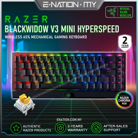 SWITCH TYPE: Razer Mechanical Switch KEY FEEL: Tactile and Clicky (Green Switch) Linear and Silent (Yellow Switch) APPROXIMATE SIZE: Tenkeyless LIGHTING: Razer Chroma™ RGB customizable backlighting with 16.8 million color options WRIST REST: None ONBOARD MEMORY: None MEDIA KEYS: None PASSTHROUGH: None CONNECTIVITY: Wired - Attached KEYCAPS: Regular ABS OTHERS - Razer™ Mechanical Switches designed for gaming - Tenkeyless form factor - Razer Synapse 3 enabled - Cable routing options - N-key roll-over with built-in anti-ghosting - Fully programmable keys with on-the-fly macro recording - Gaming mode option - 1000 Hz Ultrapolling - Aluminum matte top plate |