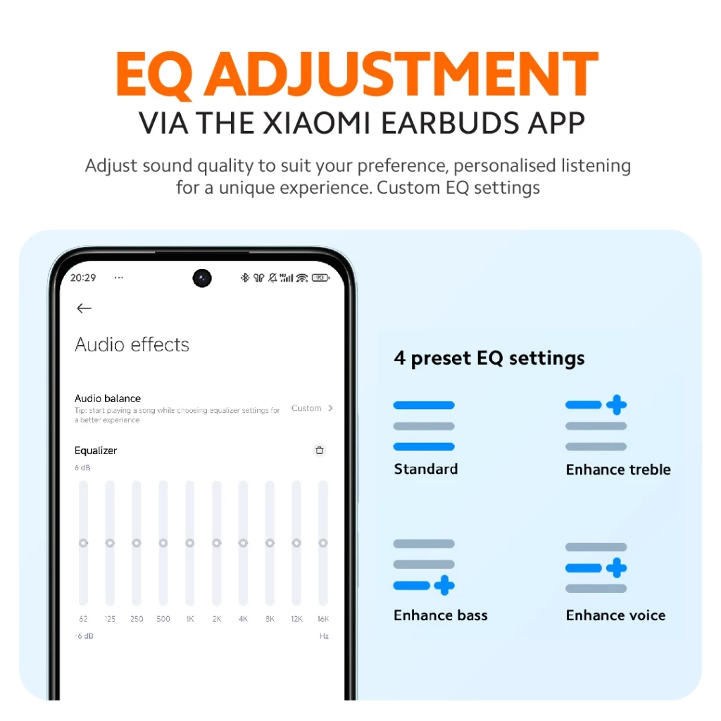 Customizable EQ Settings – 4 presets + 1 custom mode via Xiaomi Earbuds app