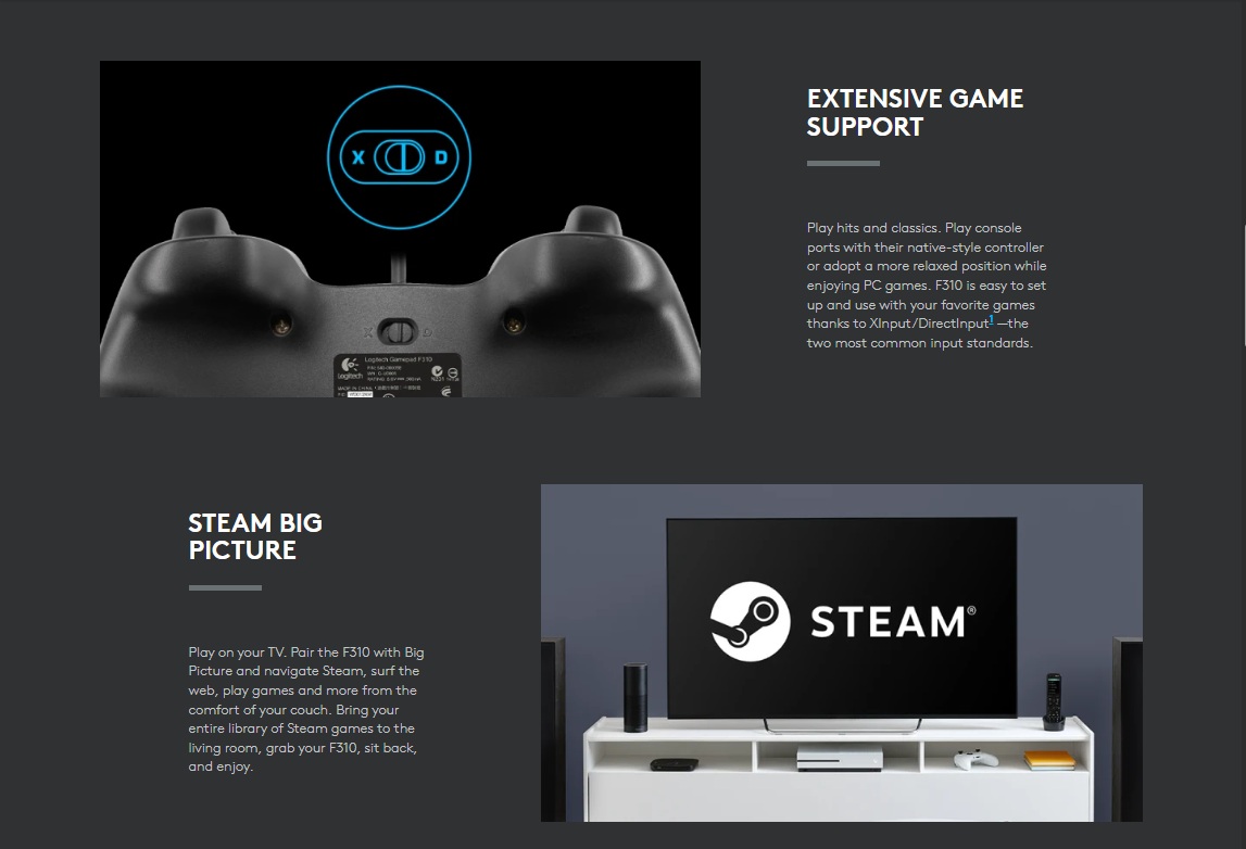 STEAM BIG PICTURE- Pair the F310 with Big Picture and navigate Steam, surf the web, play games and more from the comfort of your couch.