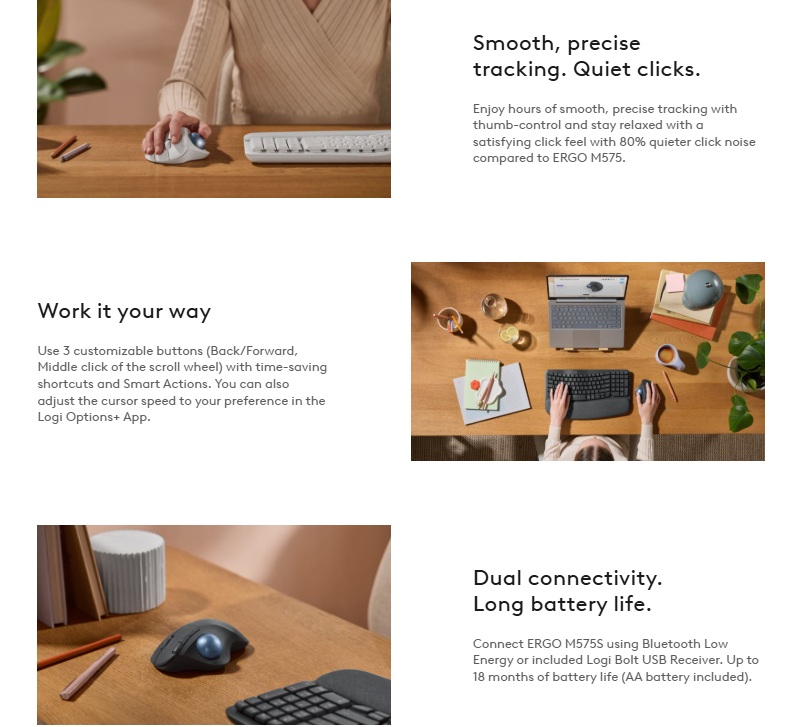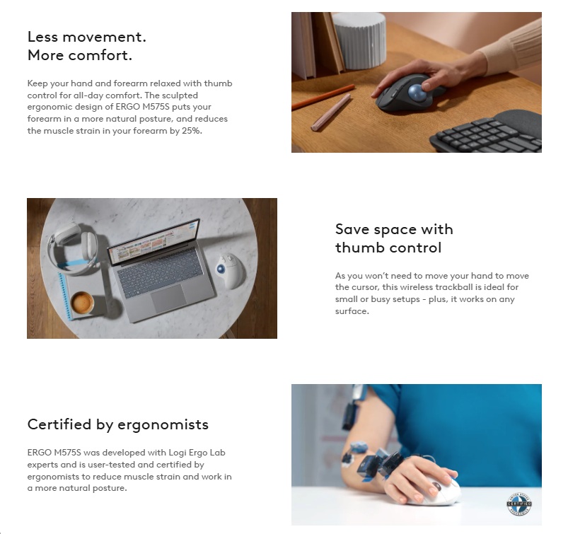 Work in your comfort zone with Ergo M575S. Wireless Trackball Work in your comfort zone. Minimize movement and maximize your comfort with ERGO M575S wireless trackball - now with quiet clicks. With thumb control you won’t need to move your arm to move the cursor, so your hand stays fully supported on the sculpted ergonomic design. A good and snug fit for most hand sizes.