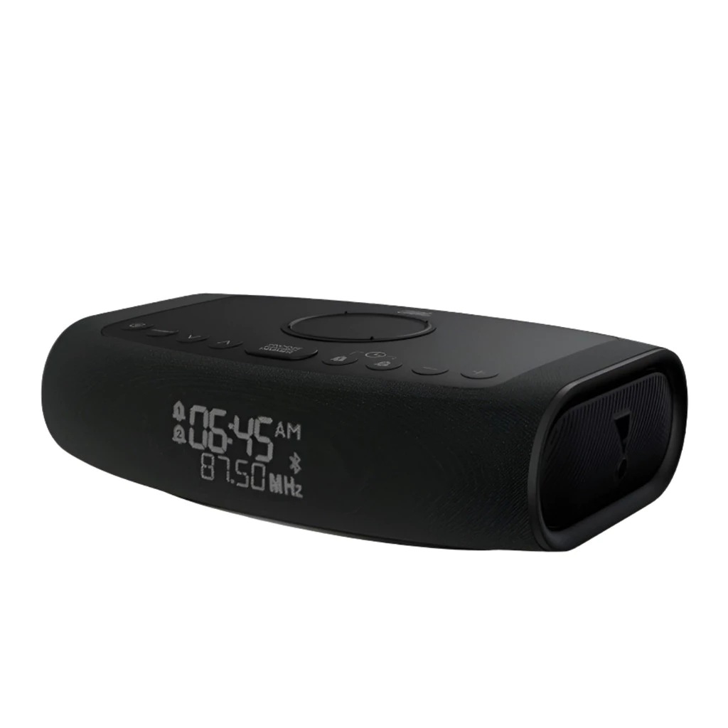 Wake up to the morning with the JBL RISE, a sleek clock radio with Bluetooth music streaming and a built-in wireless charger. The JBL RISE is the perfect bedroom companion. With a sharp LED display that clearly shows the time, alarm, and radio information, it also has a fabric cover design that will blend in with your home.