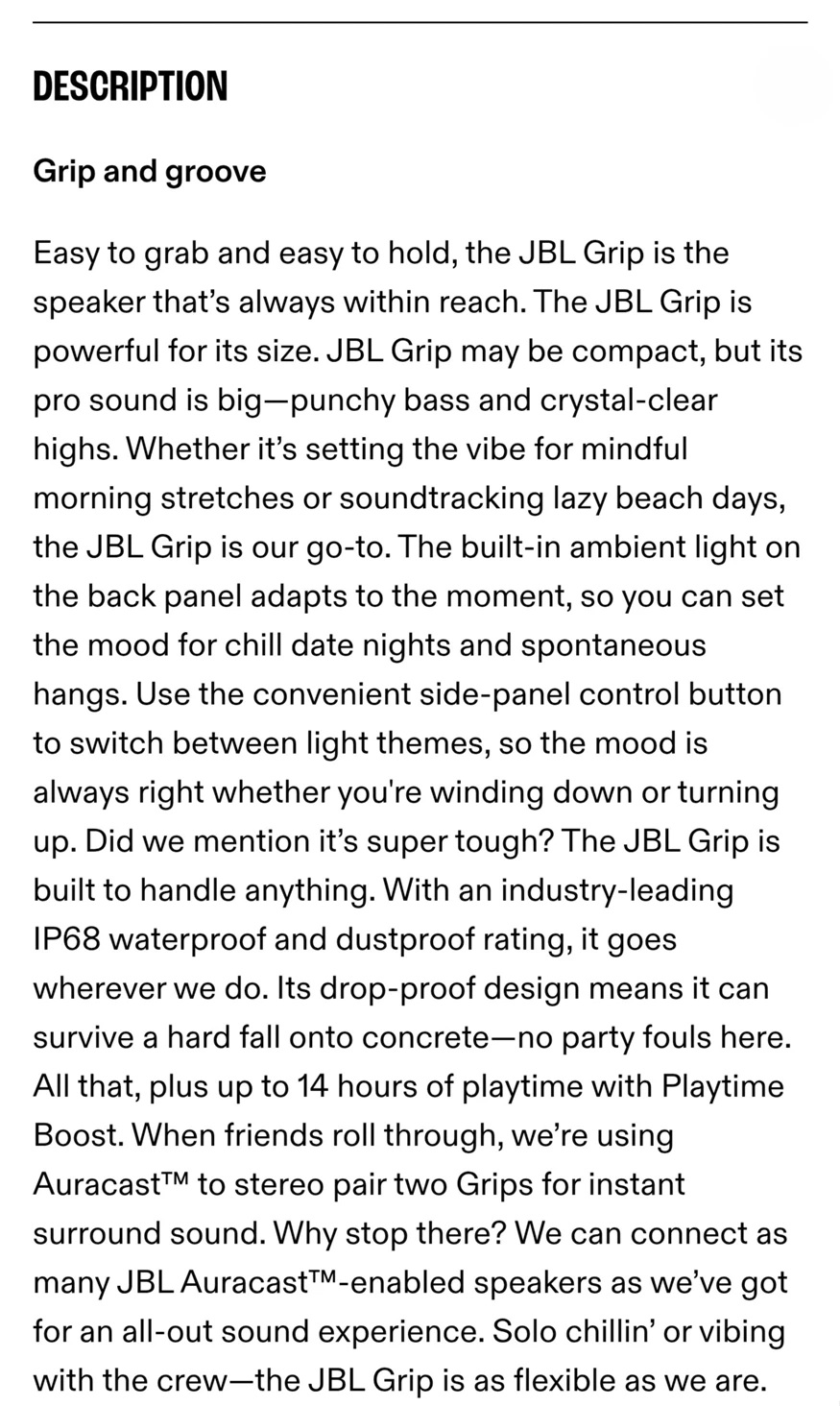 Multi-speaker connection with Auracast™-Want to share the vibes with the crew? With Auracast™, we can easily stereo pair two Grip speakers for a wider soundstage or connect multiple JBL Auracast™-enabled speakers to fill the space with the same playlist.