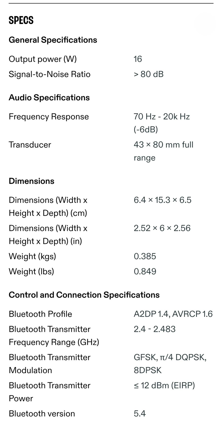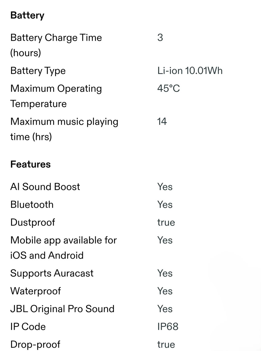 Specifications: • General specification Model No.: JBL Grip Transducers: 43 x 80 mm fullrange Output power: 16 W RMS Frequency response: 70 Hz - 20k Hz (-6dB) Signal-to-noise ratio: > 80 dB (A-Weighted) Battery type: Li-ion 10.01Wh (equivalent to 3.85V /2600mAh) Battery charge time: 3 hours (5V / 3A) Music play time: up to 14 hours (dependent on volume level and audio content) Maximum operation temperature: 45°C • Wireless Specification Bluetooth® version: 5.4 Bluetooth® profile: A2DP 1.4, AVRCP 1.6 Bluetooth® transmitter frequency range: 2400 MHz - 2483.5 MHz Bluetooth® transmitter power: ≤ 12 dBm (EIRP) Bluetooth® transmitter modulation: GFSK, π/4 DQPSK, 8DPSK • Product Dimensions Dimensions (W x H x D): 64 x 152.5 x 65.2mm/ 2.52 x 6x 2.56” Net weight: 0.385 kg/ 0.849 lbs • Packaging Dimensions Dimensions (W x H x D): 80 x 165 x 90 mm / 3.15 x 6.5 x 3.54” Gross weight: 0.523 kg/ 1.15 lbs |