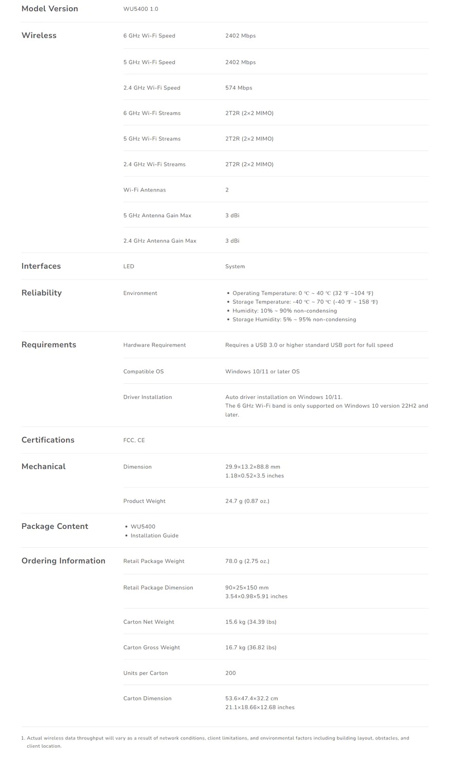 -Auto driver installation on Windows 10/11. -The 6 GHz Wi-Fi band is only supported on Windows 10 version 22H2 and later. Mechanical: -Dimension29.9×13.2×88.8 mm/ 1.18×0.52×3.5 inches -Product Weight: 24.7 g (0.87 oz.) -Certifications: FCC, CE -Units per Carton: 200 -Carton Dimension: 53.6×47.4×32.2 cm/ 21.1×18.66×12.68 inches |