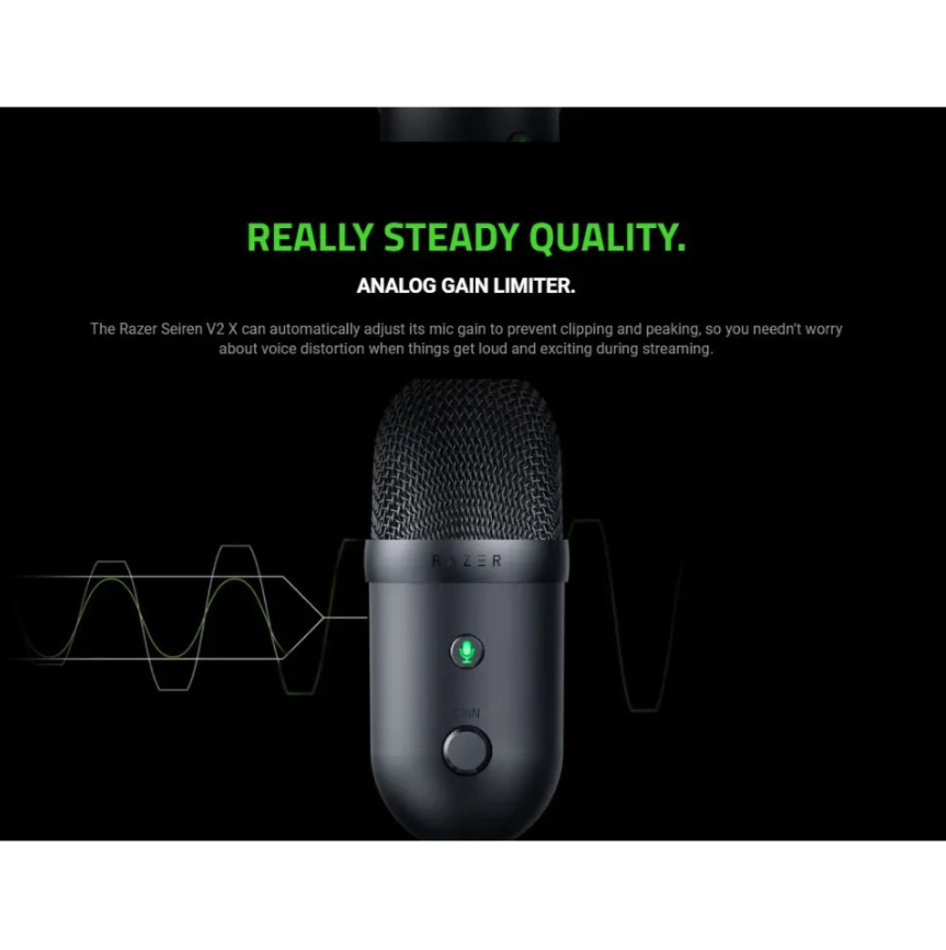 The Razer Seiren V2 X can automatically adjust its mic gain to prevent clipping and peaking, so you needn’t worry about voice distortion when things get loud and exciting during streaming.