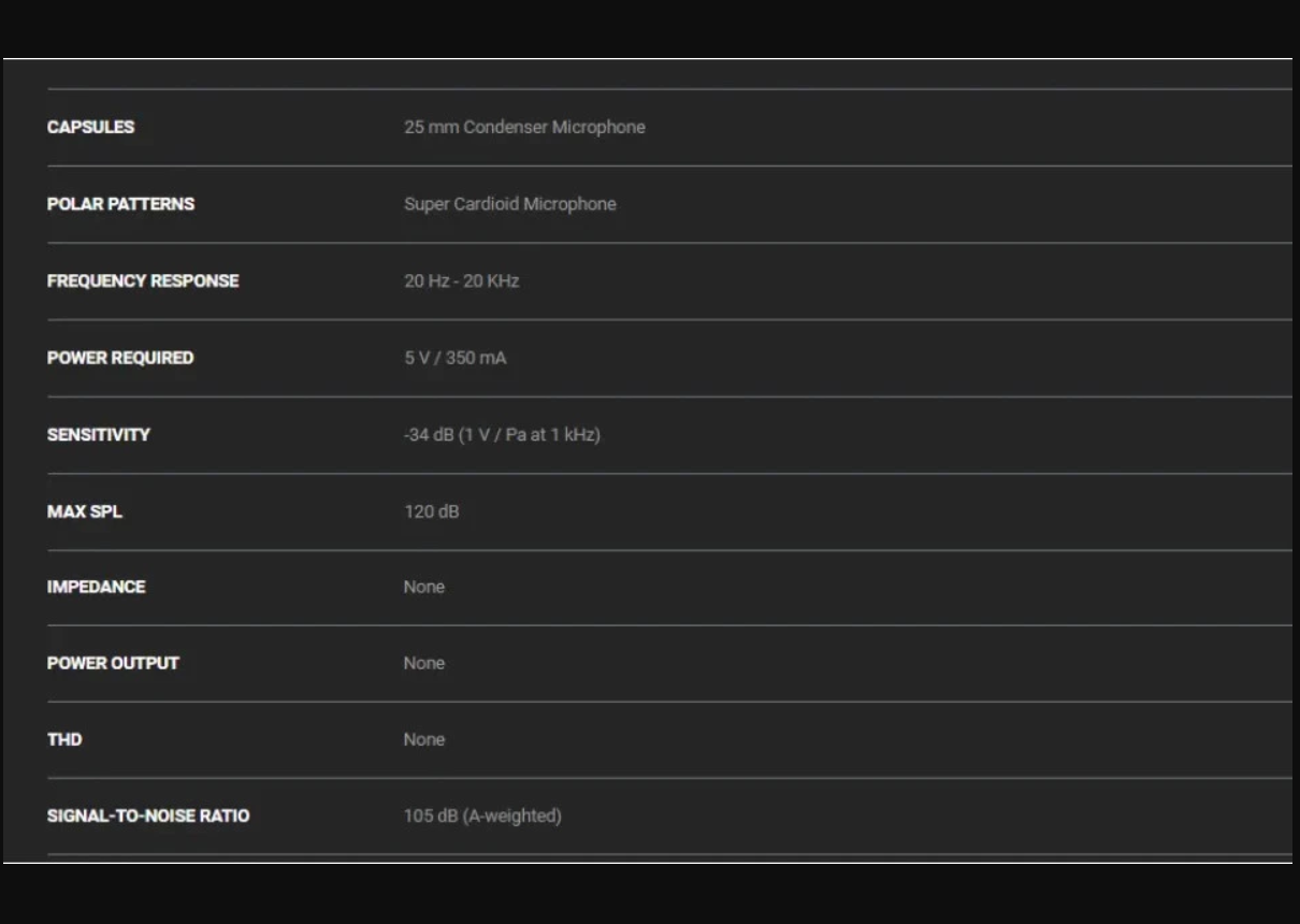 - Sensitivity: -34 dB (1 V/Pa at 1 kHz)