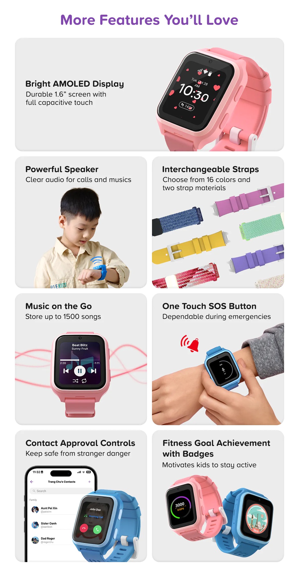 ► Storage: 1GB RAM + 8GB internal memory ► Operating System: FoneOS (based on Android 8.1) ► Display: 1.6 inch AMOLED screen Camera: 2MP front camera ► Dimensions: 47.4 x 40 x 14.2mmmm ► Weight: 47g ► Water Resistance Rating: IP67 ► Battery Capacity: 730mAh ► Operating Time: Over 2 days (location data uploaded every 8 minutes) ► Standby Time: Over 5 days ► Positioning System: Wi-Fi, GPS, A-GPS ► Wireless Connectivity: GSM, WCDMA, Wi-Fi, GPS ► SIM Type: Nano SIM ► Supported Languages: English, Chinese (Simplified), Chinese (Traditional), Japanese, Korean, Svenska, Norsk, Thai and more |