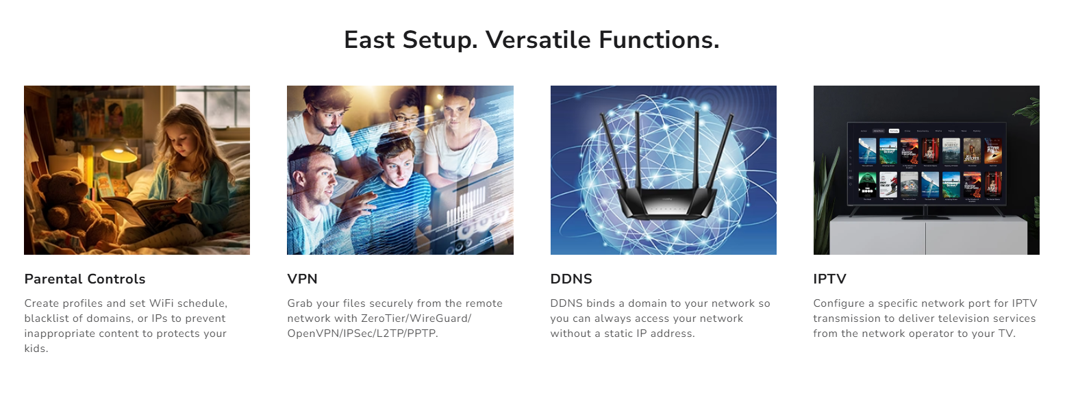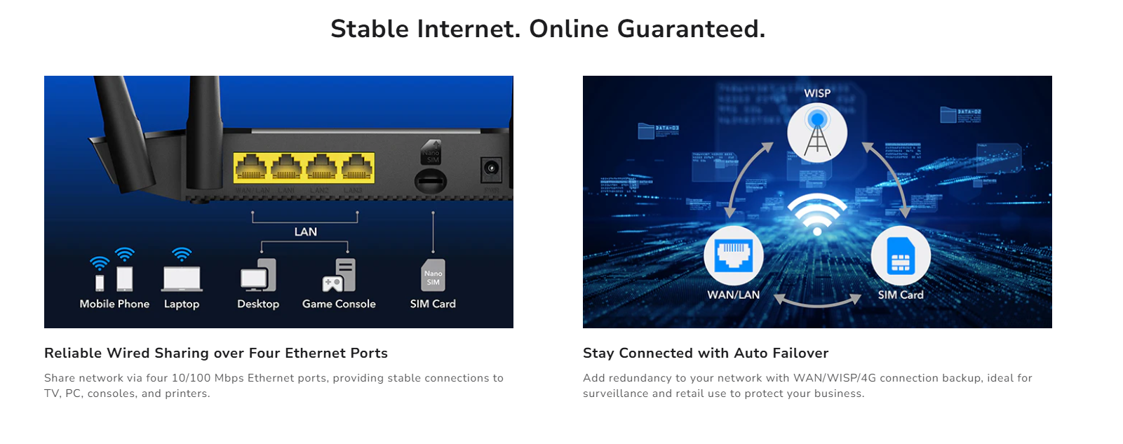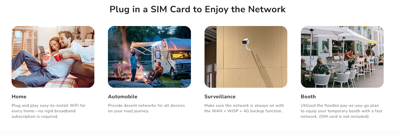 A 4G WiFi router with a nano-SIM slot and four Ethernet ports, providing easy-to-install flexible networks for home, office, surveillance, exhibitions, and RV scenarios.