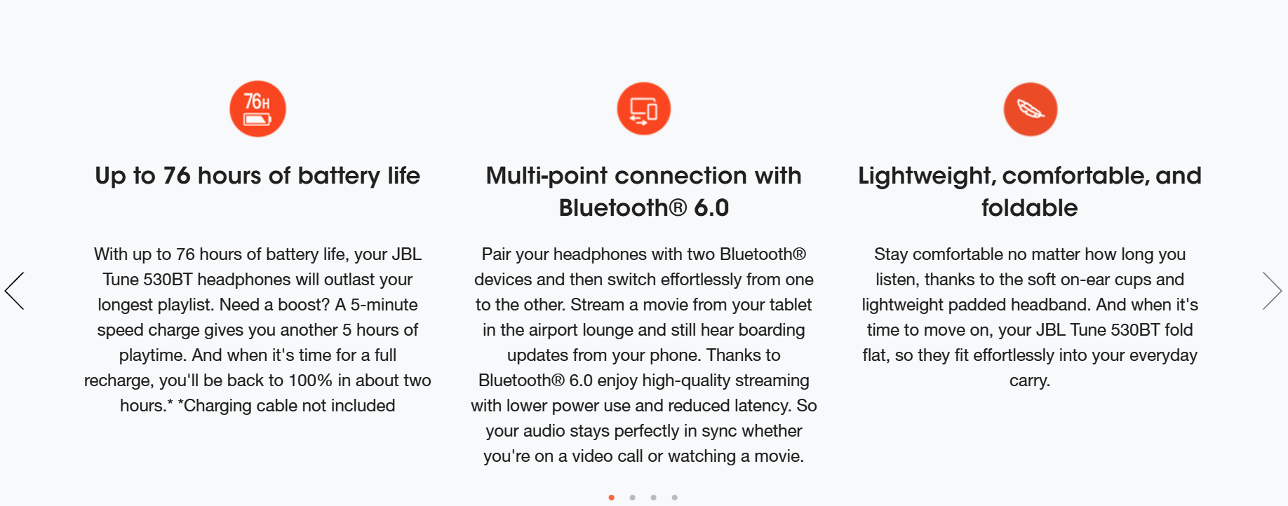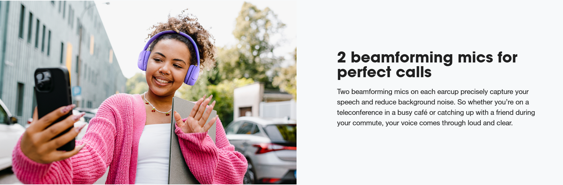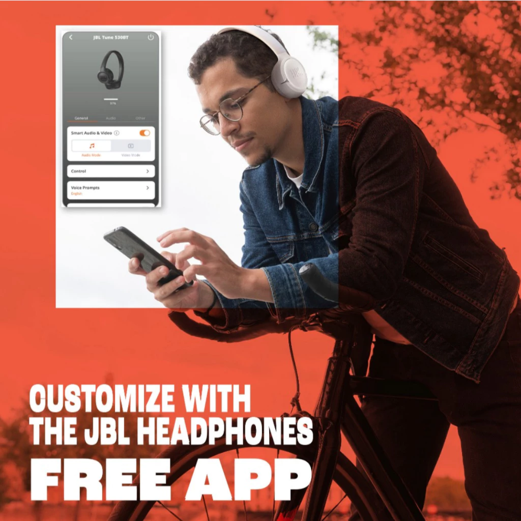 without slowing down. And when you’re running low, a quick 5-minute charge gives you up to 5 more hours of music. Thanks to 2 mics that accurately pick-up your voice, enjoy clear voice calls in any environment, while seamless Bluetooth® connectivity lets you switch effortlessly between devices, so you’re always connected to what matters. Personalize your sound with the JBL Headphones app, guided by clear voice prompts that make setup simple. Lightweight, all-day comfortable, and effortlessly foldable, JBL Tune 530BT headphones are built to move with you and crafted to match your style.