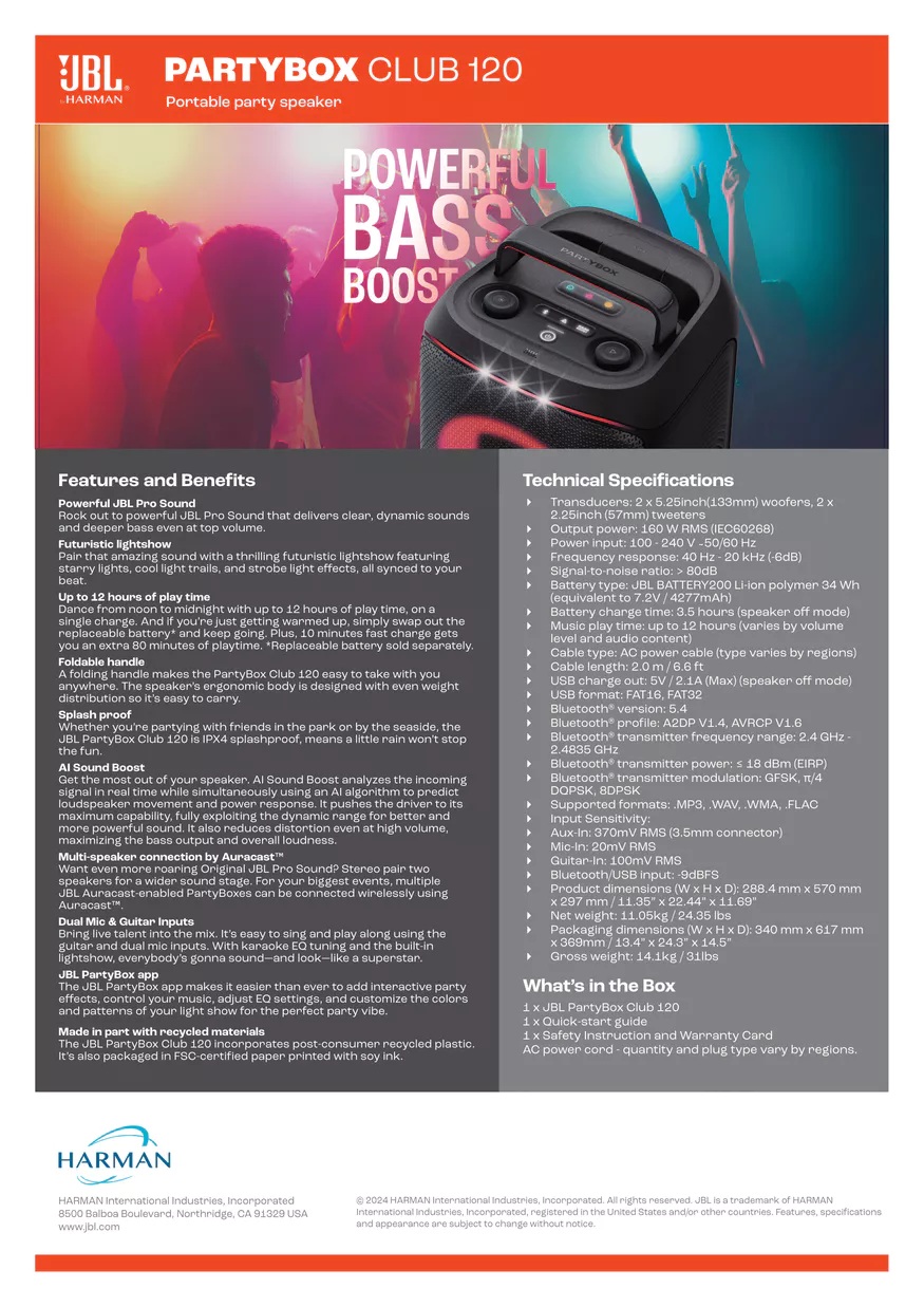 Splash proof-- Whether you’re partying with friends in the park or by the seaside, the JBL PartyBox Club 120 is IPX4 splashproof, means a little rain won’t stop the fun.